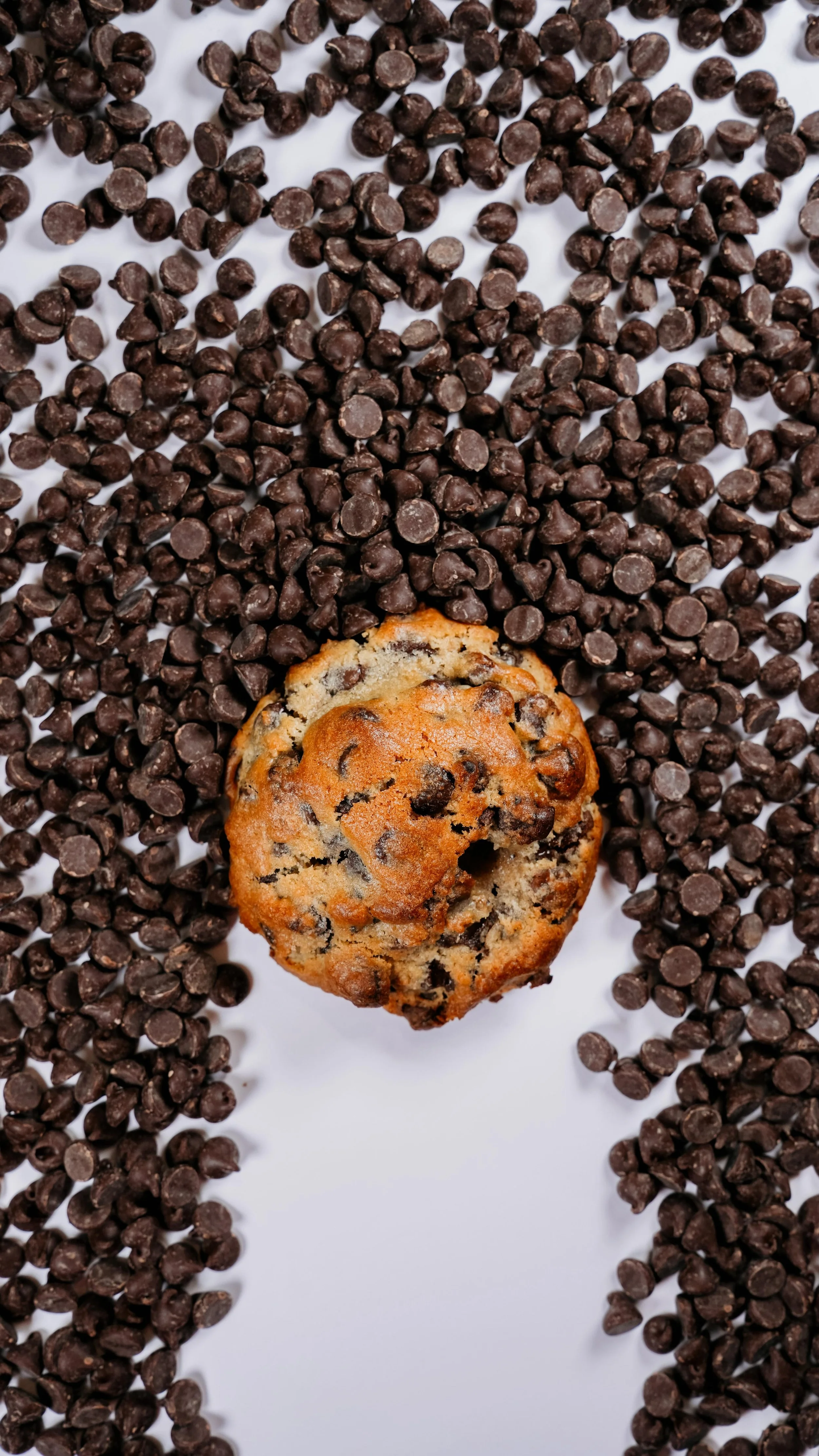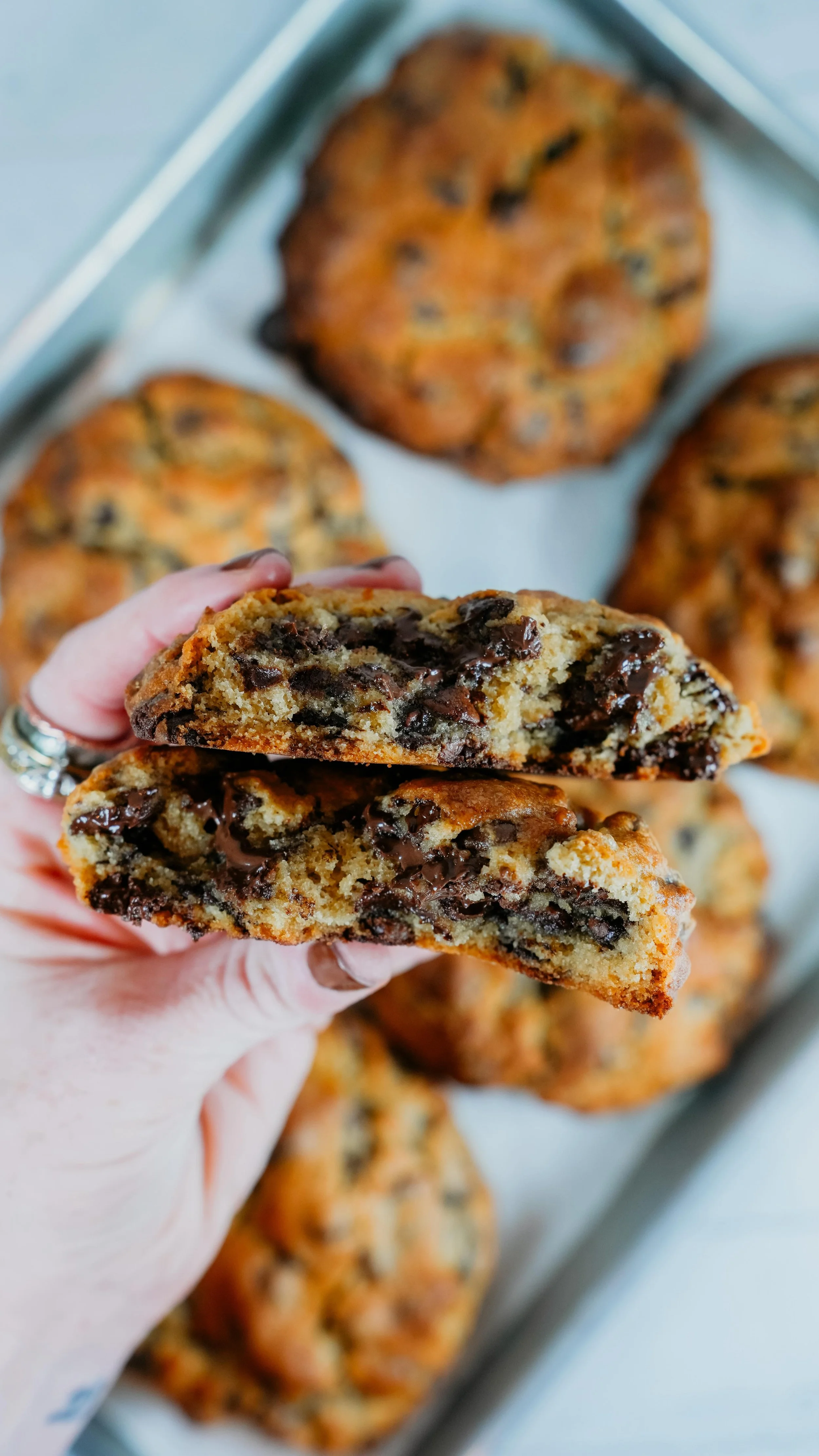 Freshly baked chocolate chip cookies on a tray